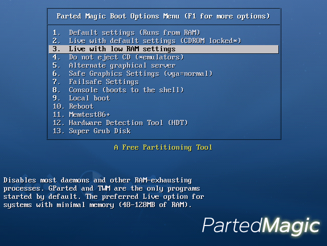 L’opzione di default, al termine del countdown se non interverremo, avvierà Parted Magic utilizzando una unità virtuale in RAM e per questo occorrerà un quantitativo di almeno 196MB (meglio 256MB). Naturalmente Parted Magic è in grado di avviarsi anche su sistemi più datati ed in questi casi è bene evitare di scegliere la voce di default ma provare, ad esempio, la modalità live per la quale occorrono almeno 128MB con CD obbligatoriamente lasciato nel lettore, oppure utilizzare l’opzione Live with low RAM settings per la quale sono necessari un minimo di 48MB così come riportato nella legenda che appare in basso per ogni voce scelta.