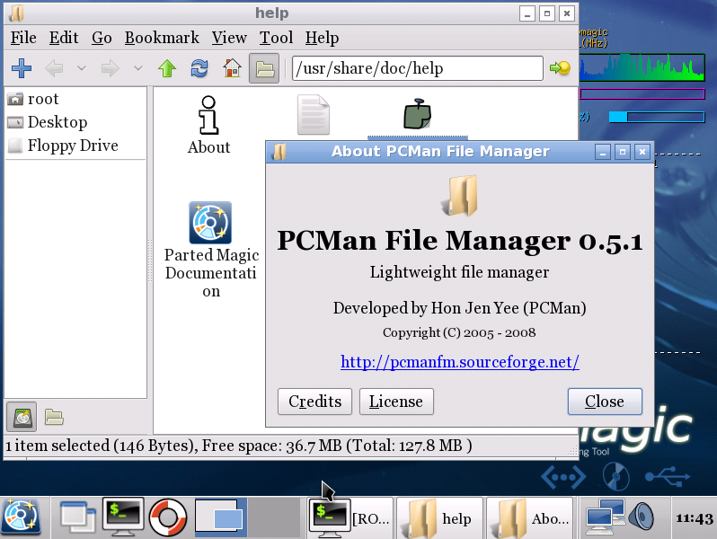 La versione del kernel in uso è la 2.6.30.6 mentre per l’ambiente desktop è stato scelto LXDE conferendo quindi a Parted Magic una sufficiente “leggerezza” e al tempo stesso un ambiente molto gradevole all’uso. Il file manager è PCMan.