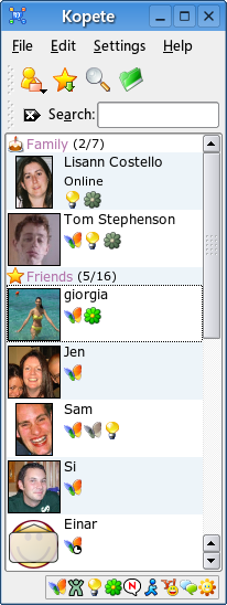Kopete è un instant messenger creato per supportare moltissimi protocolli come AIM, ICQ, MSN, Yahoo, Jabber, IRC, Gadu-Gadu, Novell GroupWise Messenger, e altri ancora. Anche se può funzionare in numerosi ambienti grafici, è integrato nel desktop environment KDE. È stato progettato per essere flessibile ed è adatto per l’uso personale e aziendale. L’obiettivo di Kopete è quello di fornire agli utenti un unico programma per l’accesso a qualsiasi tipo di protocollo, non dimenticando però funzionalità aggiuntive e plugin. Kopete possiede anche funzionalità per migliorare i suoi strumenti di messaggistica istantanea, come messaggi crittografati, archiviazione, e di molti altri effetti utili e divertenti. Pur essendo un programma completo possiamo riscontrare alcuni difetti; il suo stile è abbastanza semplice, scontato e poco personalizzabile rispetto agli altri programmi. Essendo un programma di KDE, non può essere usato da tutti e se viene utilizzato su un diverso ambiente grafico risulta lento e inefficace.