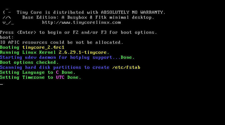 Scaricata l’immagine, masterizziamola su un CD riscrivibile. La scelta del riscrivibile è in previsione di aggiornamenti a future versioni visto che con cadenza quindicinale da un periodo di tempo a questa parte viene rilasciata una nuova versione e non ci stupiremo se mentre leggete questa recensione possa esserci stato un nuovo rilascio, ad esempio la versione 2.4RC2 oppure la 2.4 stabile! E’ comunque possibile lasciare la ISO anche in una cartella temporanea se la nostra intenzione è di provare TCL su macchina virtuale come si è optato in questa sede (nello specifico utilizzando VirtualBox). Seguendo l’usuale procedura per la creazione di una macchina virtuale, alla richiesta dell’immagine gli indicheremo la ISO appena scaricata avviando successivamente la stessa macchina virtuale. Alla prima schermata, premendo semplicemente Invio, installeremo TCL interamente in RAM.