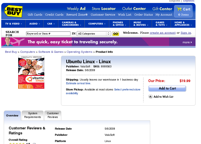 Windows non funziona? Sei stanco di virus, spyware e di perdite di tempo? Allora Ubuntu Linux è quello che fa per te. Sono questi gli slogan che campeggiano sulle nuove confezioni di Ubuntu Linux, ora in vendita nei grandi magazzini americani Best Buy.