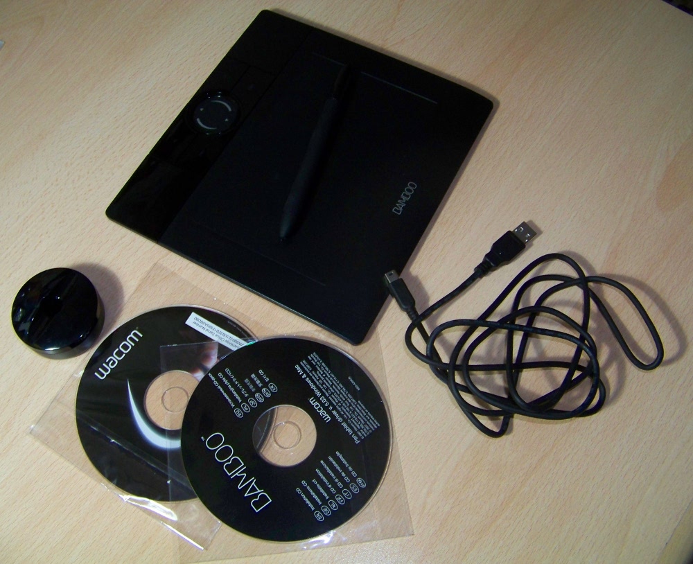 Sono rimasto subito incuriosito dal prodotto Wacom Bamboo essenzialmente per due motivi. Il primo, quello principale, per capire come sia attualmente messo il pinguino in un ambito tipicamente orientato all’universo proprietario (Windows e Mac OS X). Il secondo, ovviamente, per testare anche il prodotto sul campo. Non sono mancate le sorprese. Giunto in redazione, ci ritroviamo difronte ad un’affascinante confezione nera che al suo interno include la tavoletta Wacom Bamboo, la stilo per disegnare con tanto di appoggio circolare, cavo USB e dischi driver per Windows e Mac OS X. Il look, dunque, è il primo punto a favore di questo prodotto.