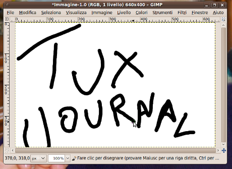Ecco allora illuminarsi i tasti funzione. Armati di penna abbiamo subito provato a sfruttarla come dispositivo di puntamento. Siamo riusciti a cliccare su icone, piccole voci e menu con una certa facilità. Non male per una tavoletta grafica. Quella dell’alta sensibilità è un chiaro sinonimo di qualità. Non è andata altrettanto bene l’esperienza all’interno di GIMP, visto che abbiamo fatto un tantino fatica a scrivere “Tux Journal” in una nuova immagine. Ma è tutta una questione di abitudine. Basta un po’ di allenamento e riuscirete a diventare dei veri disegnatori (a patto che il disegno sia la vostra passione).